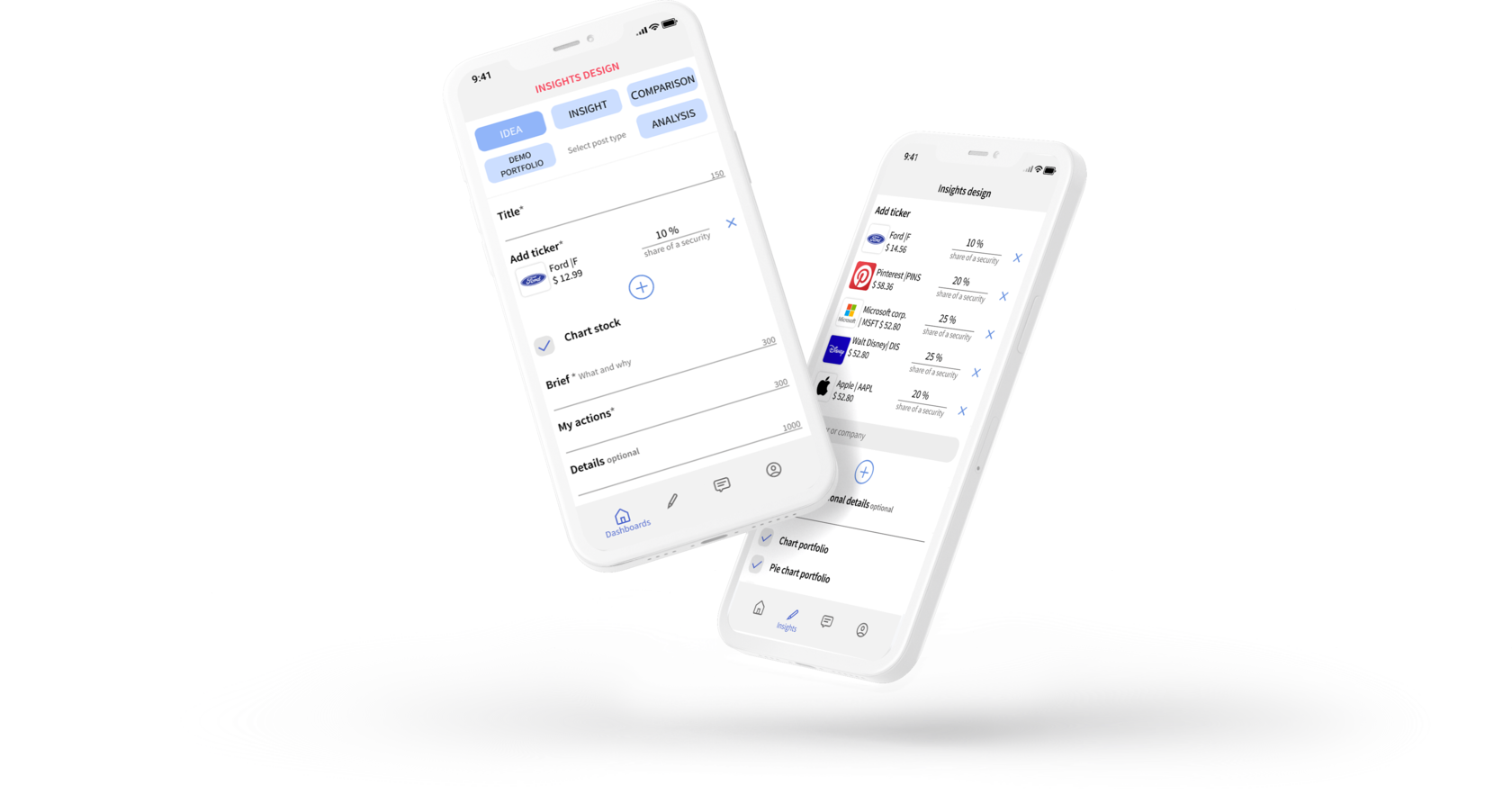 All you need to do is generate ideas and insights; the content editing tool is built in, with all the possible charts and reports at hand to quote. There are several pre-designed frames for your ideas: demo portfolio, investment idea, comparison of 2 companies, etc